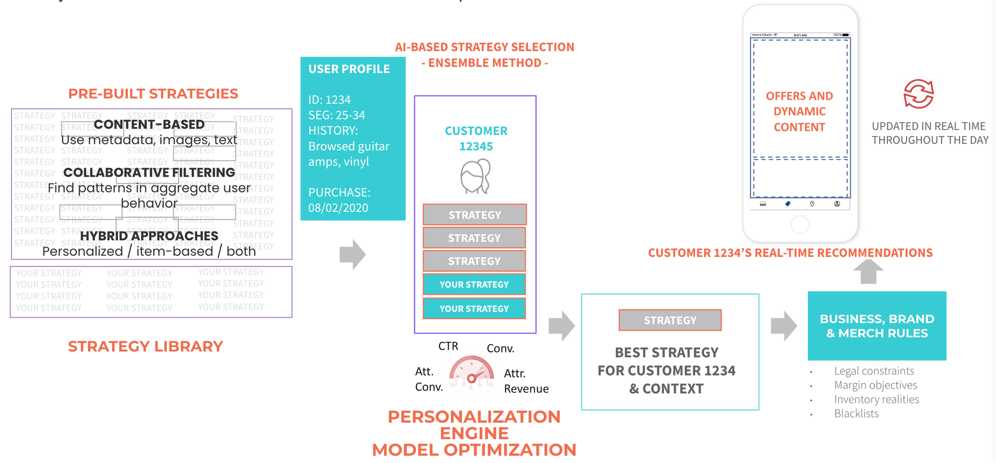 For "SportsFlex," these themes aren't tactics – they're the backbone of a comprehensive omnichannel data-driven initiative, ensuring Jane's experiences are consistent, personal, and engaging across all touchpoints. There are 100s of tactics within each Strategy theme. By marrying data insights with thoughtful execution, "SportsFlex" crafts a shopping journey for Jane that feels almost bespoke, driving brand loyalty and revenue. We use the Themes and tie them to specific personalization model strategies noted next and below. These models get built out specifically to each user profile 1:1. These are the models in the library that the personalization engine uses to make the right decision to handle our Omnichannel dream and goal.