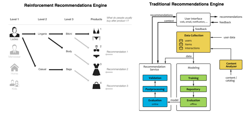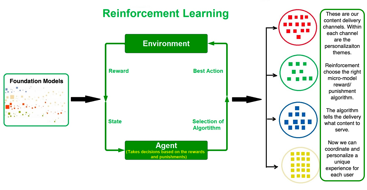 While the AI data control plane and foundational models provide a robust base, a natural progression integrates a newer approach towards reinforcement learning (RL) as the new downstream personalization engine - it could replace the older ensemble model library approach. This is essential for several reasons. Firstly, with the power of A.I., an organization can customize the UI for every user using RL, ensuring their app or website experience is like no other - traditional web shopping, mobile apps, and service apps can be completely customized on the fly without managing individual model libraries and rules for each themed strategy.