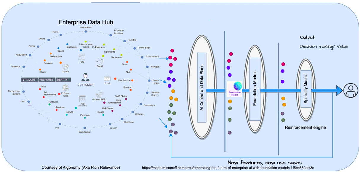 Two vendors that were and are at the forefront of this multi-model Machine learning approach are Dynamic Yield and Rich Relevance (Now part of Algonomy). There are other newer vendors, and my idea of a layer above the specialty model strategies is the next evolution, leveraging the newer LLM(Large Language models), now called Foundation models, as inputs to the personalization specialty model library. Even if the older vendors mentioned are behind the 8-ball, they could easily incorporate the new AI/Data control plane and Foundational models into their infrastructure. Both the named vendors above have started to do this with Deep learning, Hyper-personalization, and other approaches. However, the innovations they promote and have created are still highly valuable and have not changed the basics of Marketing 101 regarding segmentation, personalization, and highly coveted 1:1 conversations with customers.