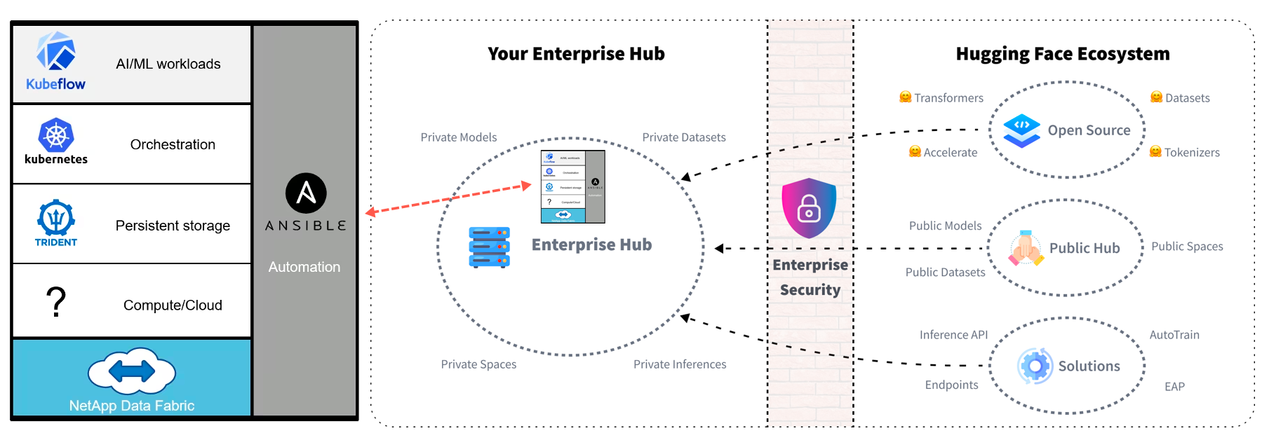 Databricks and many underlying infrastructure tools like HuggingFace.co - Enterprise hub, C3.Ai, H2o.ai, KubeFlow, and NetApp actually name their approach an AI Control Plane, but it is still too cumbersome. Here is an illustration where eI combined NetApp with HuggingFace's Enterprise Hub to create a combined AI Data Control plane – There would need to be a different UI/UX abstraction sitting on top of this reference.