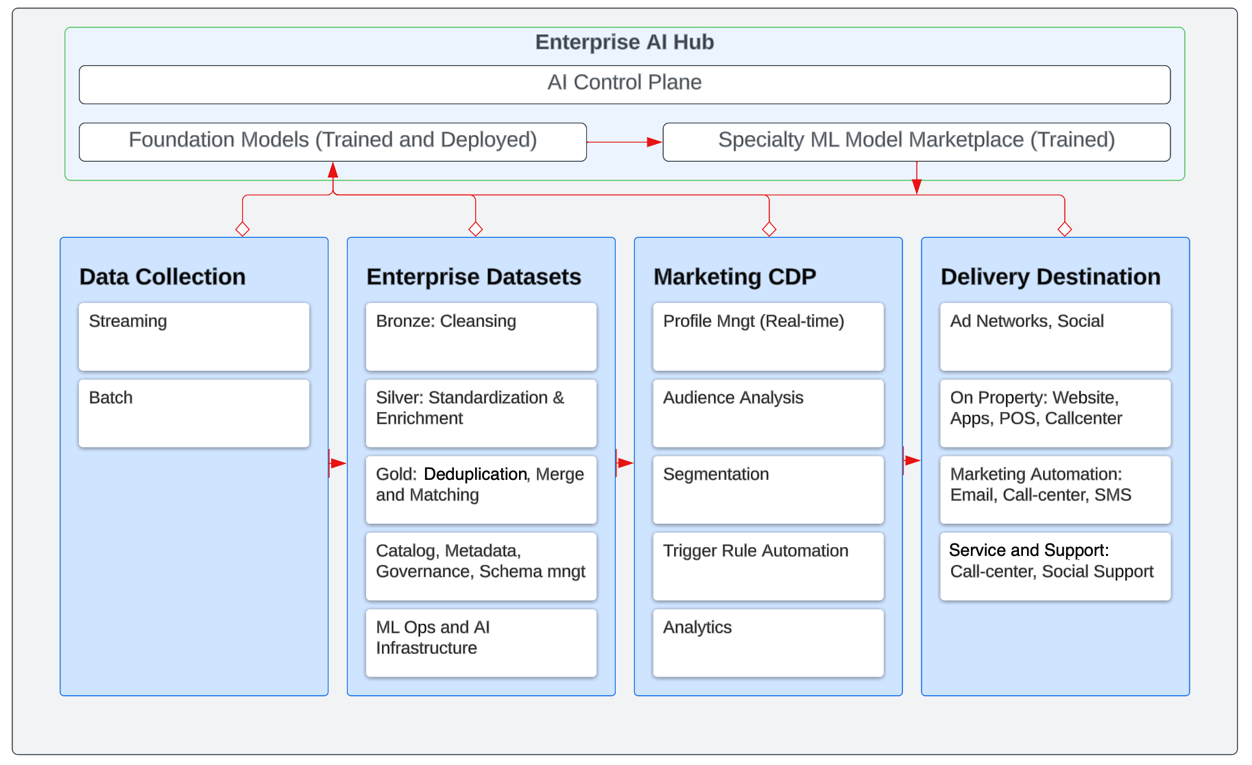 The two resources referenced below talk about this concept a bit more - not quite how I am addressing it but they both gave me the concept idea. CDP vendors must address this going forward as they embed the foundational models into their platforms. https://medium.com/@hzmarrou/embracing-the-future-of-enterprise-ai-with-foundation-models-i-f5bc659acf3e and NumberStation.ai - Foundation Models in the Modern Data Stack - I illustrated many of the concepts above in the diagrams.