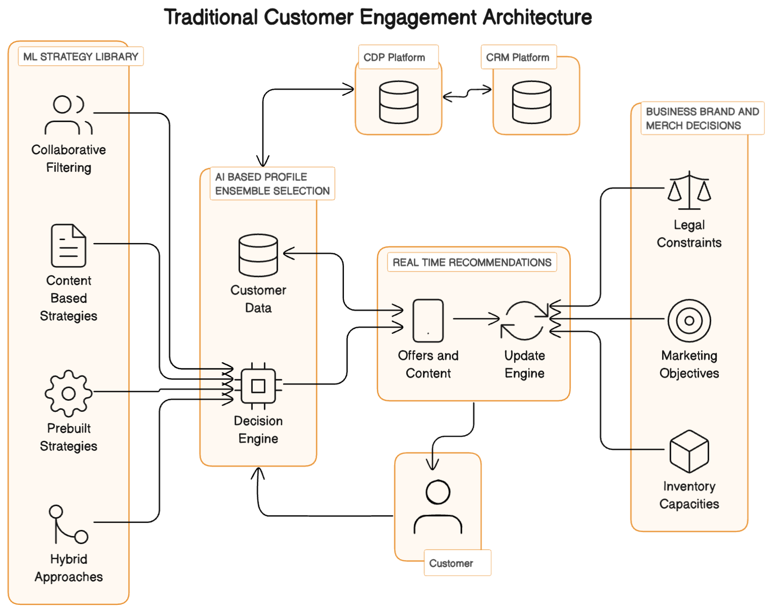 Achieving hyper-personalization at scale requires sophisticated technology, data, and strategy orchestration - the illustration below helps visualize what it might look like. CRM/CDP systems serve as the backbone, collecting and integrating customer data from various touchpoints, while AI and ML provide the analytical power to process this data in real-time, identifying patterns and predicting behaviors.