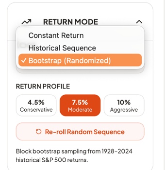 What mattered was the portfolio's monthly and annual return %, and how that return compounds over time, and the sequence in which they occurred. So that is why I built a randomization-of-returns feature into the Input screen in the left rail. The "Learn" site talks about this a bit and why I used a bootstrap return engine vs a Monte Carlo engine.