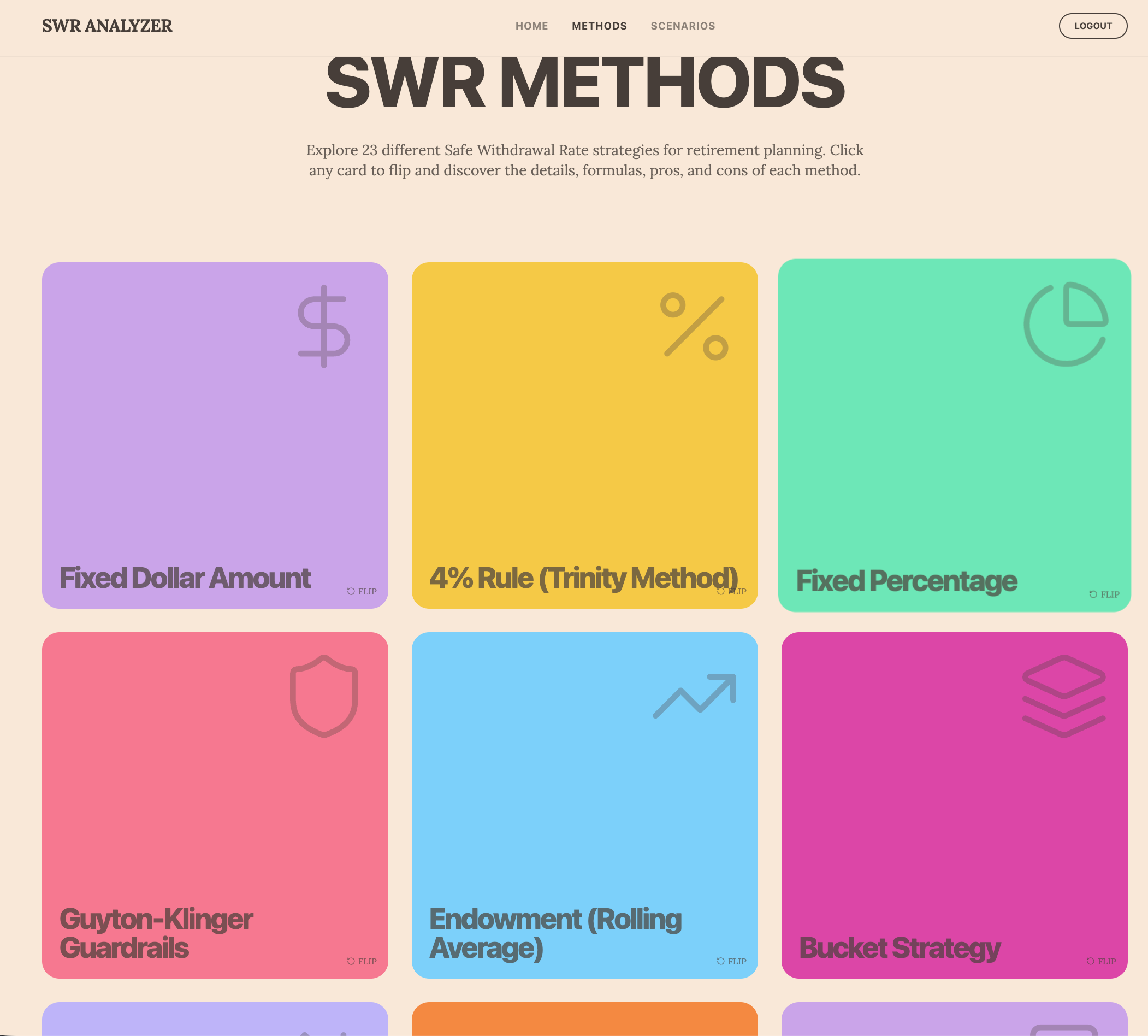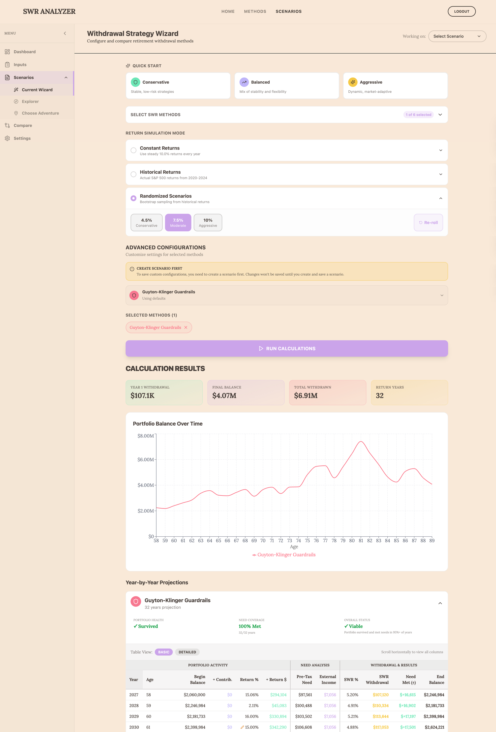 Once I had imported and migrated to my local machine, Claude and I settled on a clean architecture in which each withdrawal method implements a simple interface. A user provides input, and it returns year-by-year projections. But designing that interface required understanding what every method would need: ages, portfolio values, Social Security timing, tax rates, external income, return assumptions, and method-specific configurations. I'm probably still not 100% where I need to be, but it's getting closer. I am not a front-end designer, so I had a little help and leveraged some free style guides and fonts, but I also needed a template or design that worked for the masses if I decided to release this. I am still not all that happy with it, but if you know me, I will probably never be satisfied with my own work. If you have color, UX flow, or Ui design and think there is a better mousetrap, feel free to shoot me a note.