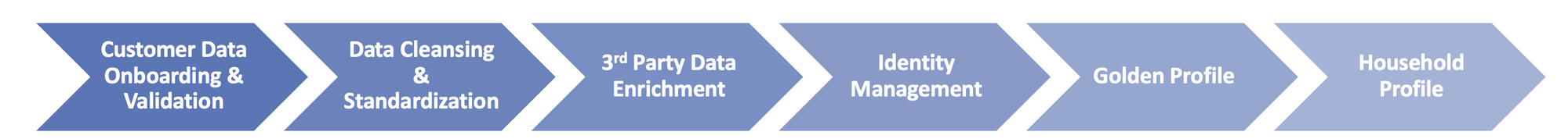 - Final Deduplication and Identity Verification: Finally, any remaining duplicates are removed, and a single, verified identity is formed for each customer. Often called the GOLD Profile or GOLD Customer Record (GCR). Some vendors add another option to combine multiple profiles into a household. You will see terms like Grouping or Householding - this process helps reduce cost for companies with multi-year print catalog drops or reduce the amount of marketing messages a single household would consume.