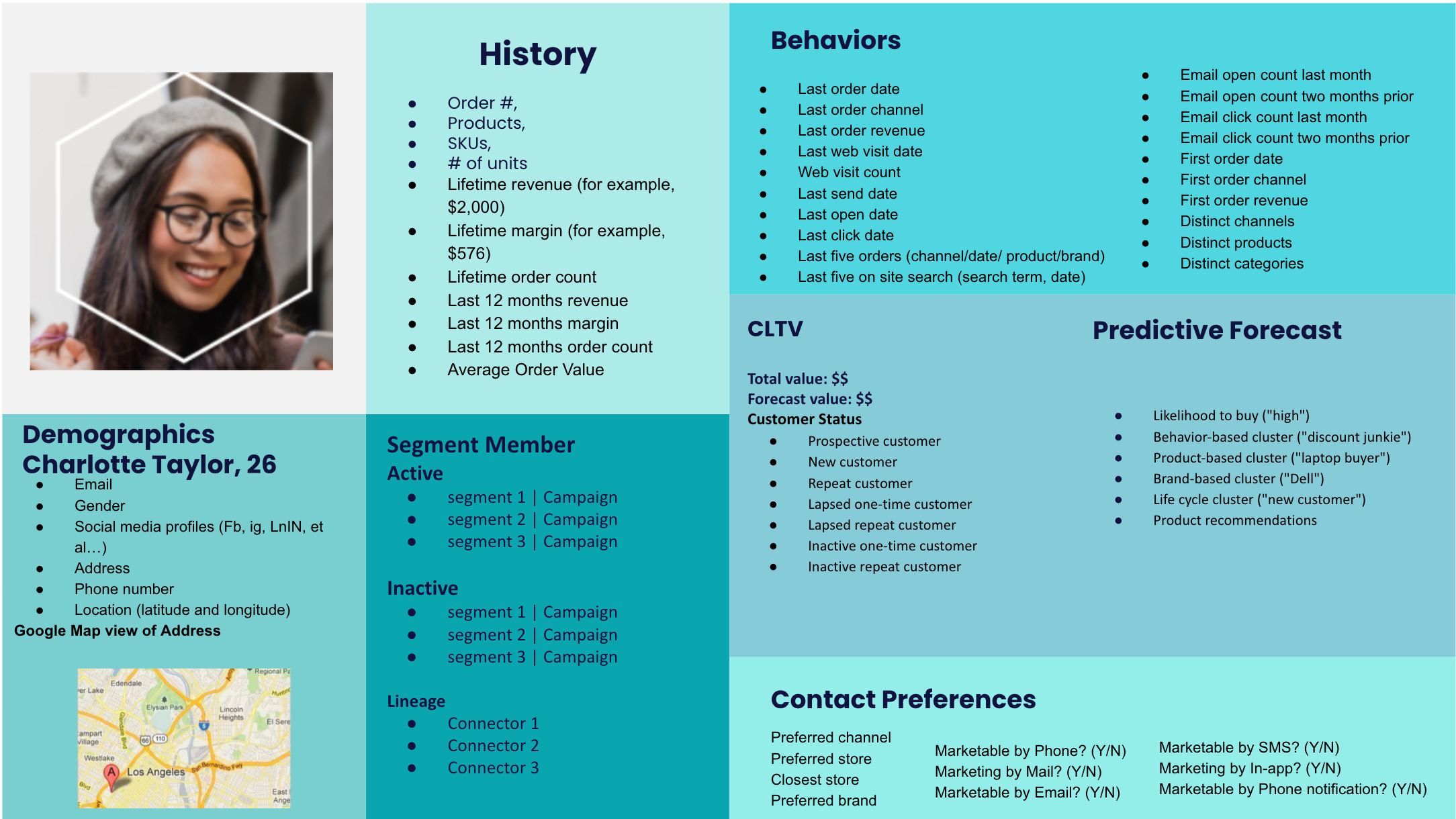 - The profile is segmented based on certain attributes and preferences like 'Loyalty' and 'STELLA'. This data can be sourced from internal behavior tracking and external data sources.
