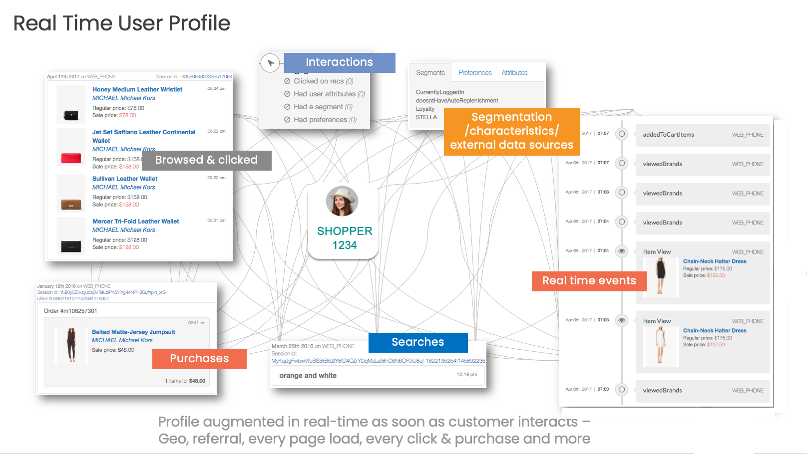 - Browsed & clicked: These interactions show the specific products the user has browsed and clicked on, such as different types of Michael Kors products. Timestamps indicate the exact time the user viewed each product.