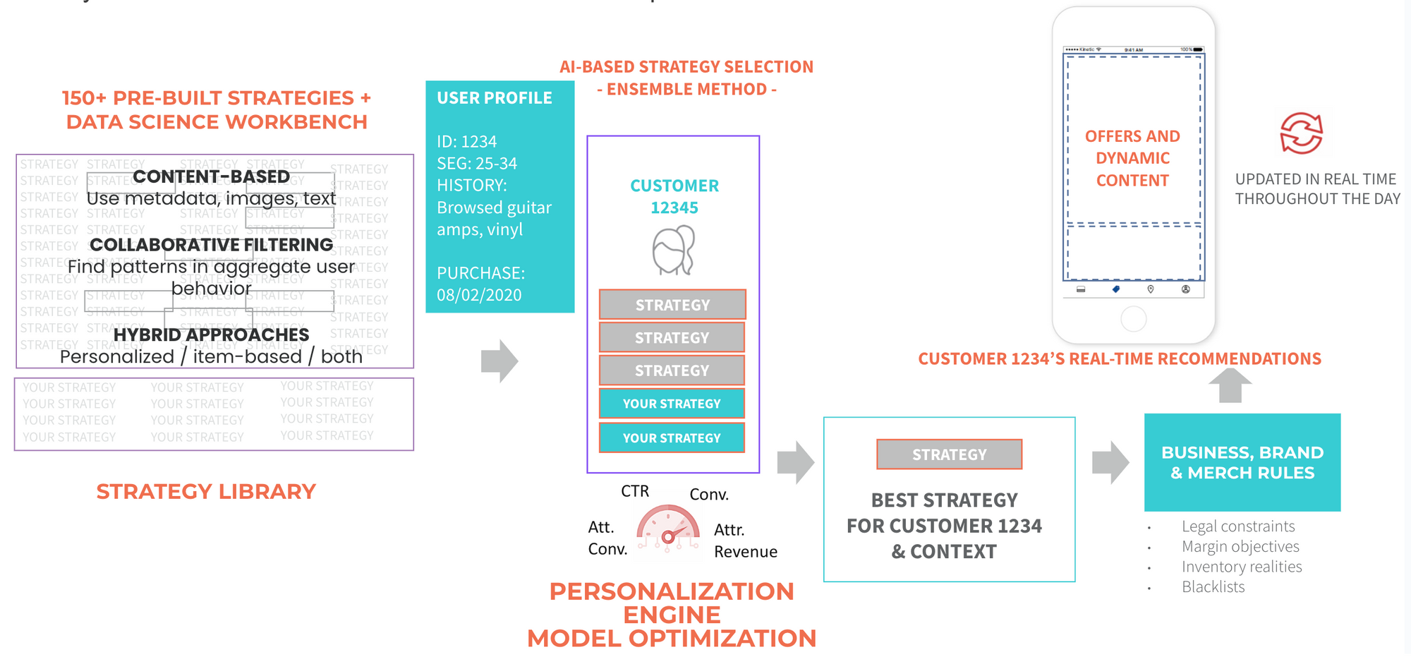- Dynamic content and offers are generated in real-time based on the user's profile and selected strategies.